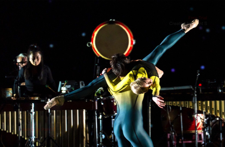 Quantum Souls – the title not immediately relatable, but a reflection of McGregor’s fascination with science – had its world premiere on the opening night of this run.  Its complex stage design (McGregor’s own) required an extra long interval to allow for installation, but when the curtain finally went up it revealed an appealing scene.  The flooring was yellow.  Upstage right was a complicated percussion set.  Assorted dancers in blue/grey and yellow individually styled costumes by the award-winning designer Saul Nash filled the stage, under Lucy Carter’s bright, yet warm light.