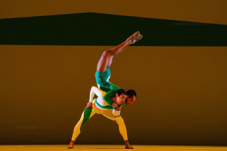 For Untitled, 2023  Wayne McGregor sought inspiration from the work of the late minimalist Cuban American artist Carmen Herrera, who created her first and only stage designs for this work.  Visually stunning in its simplicity, Untitled, 2023 is danced against the background of a white canvas cut across by a gash of baize green, a combination reflected in body-hugging costumes by Burberry, again individually styled.